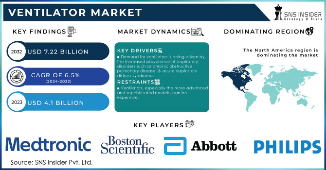 The Ventilator Market, valued at USD 4.1 Billion in 2023, is anticipated to achieve a valuation of USD 7.22 Billion by 2032, experiencing a compound annual growth rate (CAGR) of 6.5% throughout the forecast period from 2024 to 2032.